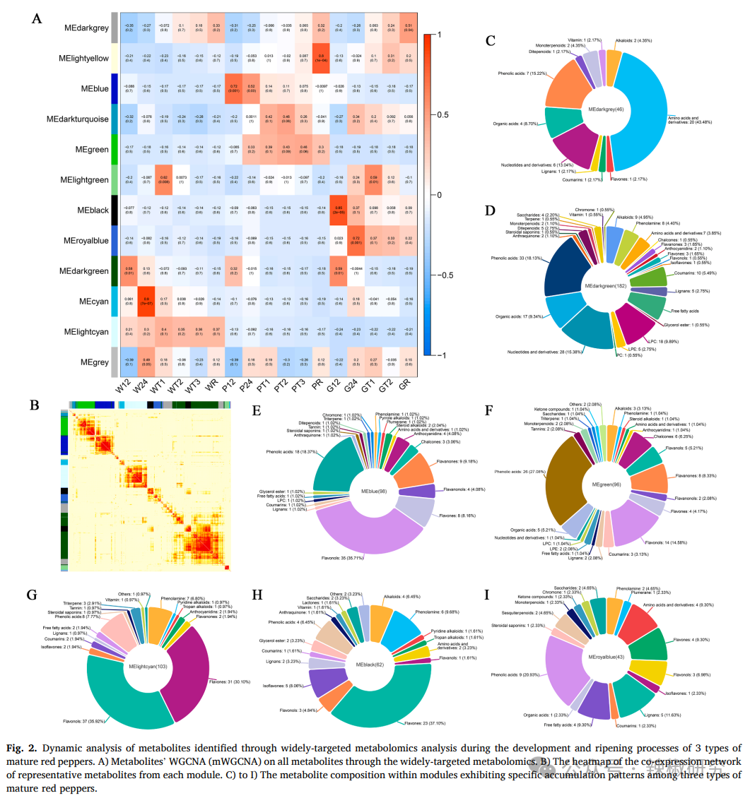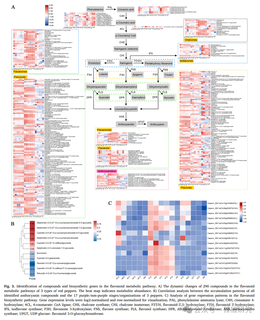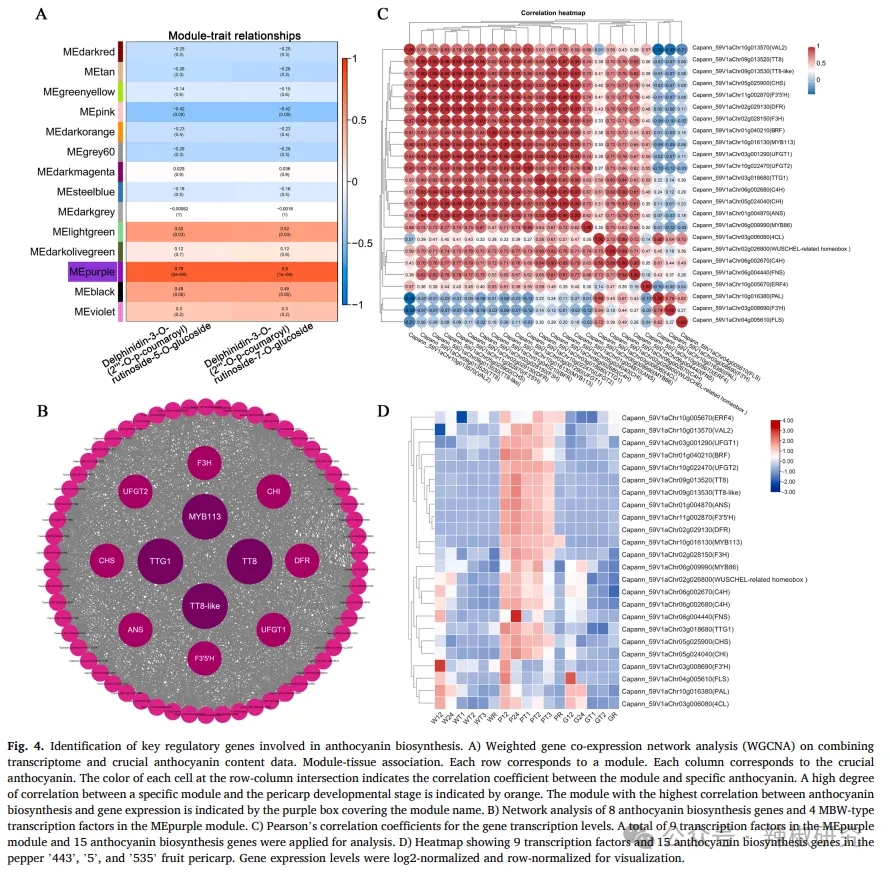 本研究首次通过广靶代谢组学和类胡萝卜素靶向代谢组学分析,在三种转色型红辣椒(白/紫/绿转红)的发育与成熟过程中鉴定了1429种代谢物。通过代谢物加权基因共表达网络分析(mWGCNA),解析了广靶代谢组中代谢物的积累模式,其中鉴定出290种类黄酮和68种类胡萝卜素,揭示了天然紫色和红色辣椒的物质基础。发现'5'号品种紫色形成关键依赖于飞燕草素-3-O-(2′''-O-p-香豆酰基)芸香糖苷-5-O-葡萄糖苷和飞燕草素-3-O-(2′''-O-p-香豆酰基)芸香糖苷-7-O-葡萄糖苷(尤以前者为主),而辣椒红素对辣椒红色呈现起决定性作用。通过整合转录组和代谢组数据进行WGCNA分析,鉴定出花青素生物合成的潜在调控基因MYB113、TT8、TT8-like、TTG1和BRF,以及辣椒红素生物合成的关键调控因子DIVARICATA1、MADS-RIN、AGL9-like和Y亚基。本研究对实现辣椒食用价值与工业应用具有重要意义,所鉴定的花青素和辣椒红素潜在调控基因为深入研究辣椒天然色素生物合成机制提供了参考依据。