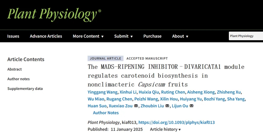 近日,邹公司院士团队欧立军教授课题组在Plant Physiology在线发表了题为“The MADS-RIPENINGINHIBITOR-DIVARICATA1 module regulates carotenoidbiosynthesis in nonclimacteric Capsicum fruits ”研究论文揭示了MADS-RIN-DIVARICATA1模块协同调控辣椒果实中辣椒红素生物合成的新机制。